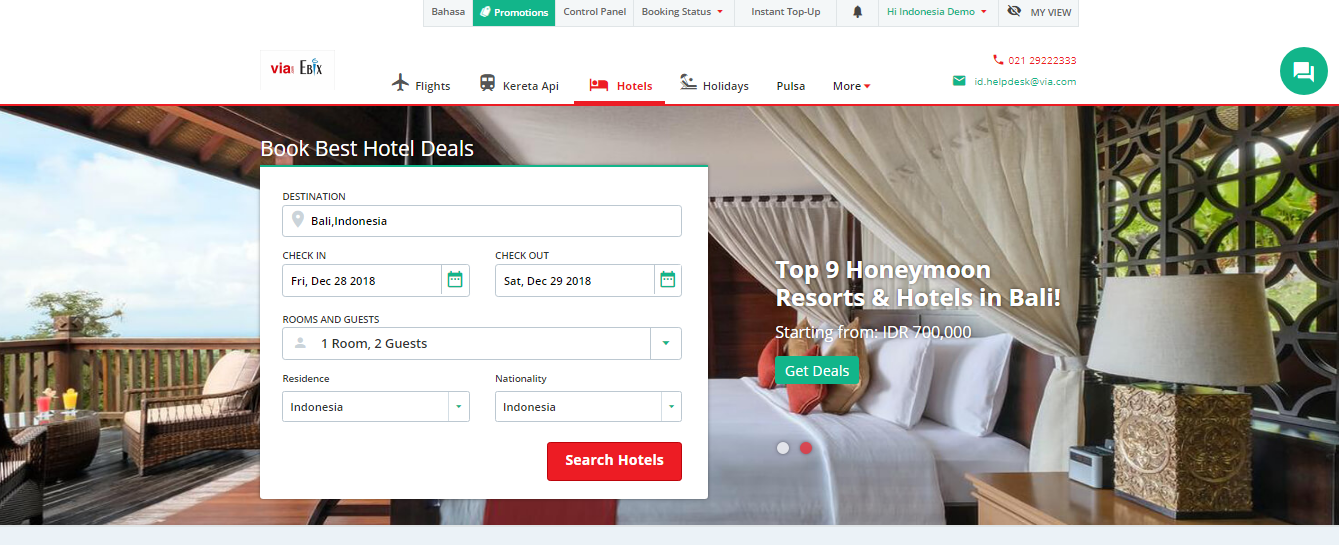 Untuk informasi mengenai promo dan produk hotel lainnya, Mitra Via dapat menghubungi Customer service kami di 021 29222 333 ext. 3 atau email id.hotels@via.com.