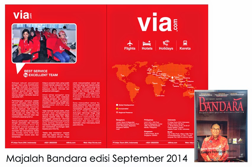 Cari tahu lebih lengkap informasi tentang Via.com di majalah Bandara edisi september 2014. Untuk info lebih lanjut mengenai Via.com hubungi customer care 24/7 Via Indonesia di nomor (021) 29 222 333 ext 8 atau email ke id.training@via.com